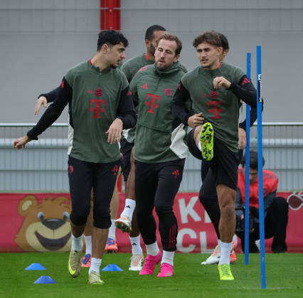 08.12.2025, Champions League, FC Bayern Muenchen, Abschlusstraining, Sabenerstrasse Muenchen, Fussball, im Bild: Harry Kane (FC Bayern Muenchen), Tom Bischof (FC Bayern Muenchen), Aleksandar Pavlovic (FC Bayern Muenchen), und Serge Gnabry (FC Bayern Muenchen) *** 08 12 2025, Champions League, FC Bayern Muenchen, Final training, Sabenerstrasse Muenchen, Football, Sport, in the picture Harry Kane FC Bayern Muenchen , Tom Bischof FC Bayern Muenchen , Aleksandar Pavlovic FC Bayern Muenchen , and Serge Gnabry FC Bayern Muenchen