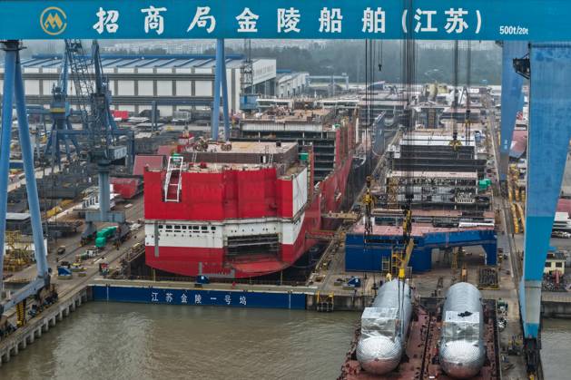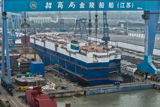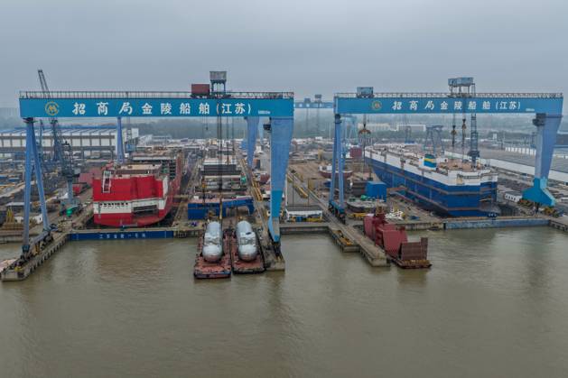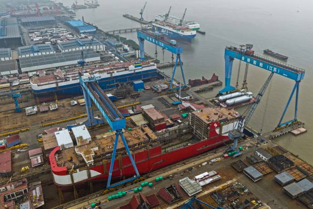 Yangtze River Shipyard YANGZHOU, CHINA - OCTOBER 14, 2025 - Shipyard along the Yangtze River in Yangzhou City, Jiangsu Province, China on October 14, 2025. Starting from October 14th, the United States will impose additional fees on Chinese owned, operated, or built vessels entering US ports, as well as all foreign built automobile transport ships. Yangzhou Jiangsu China PUBLICATIONxNOTxINxCHN Copyright: xCFOTOx i1760434195306