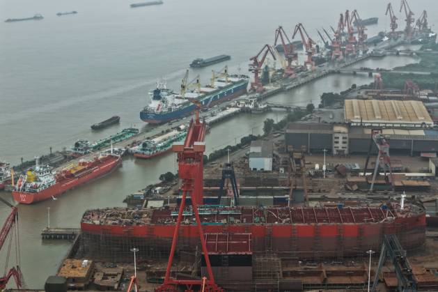 Yangtze River Shipyard YANGZHOU, CHINA - OCTOBER 14, 2025 - Shipyard along the Yangtze River in Yangzhou City, Jiangsu Province, China on October 14, 2025. Starting from October 14th, the United States will impose additional fees on Chinese owned, operated, or built vessels entering US ports, as well as all foreign built automobile transport ships. Yangzhou Jiangsu China PUBLICATIONxNOTxINxCHN Copyright: xCFOTOx i1760434195109