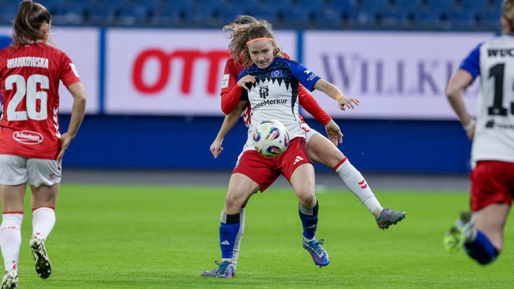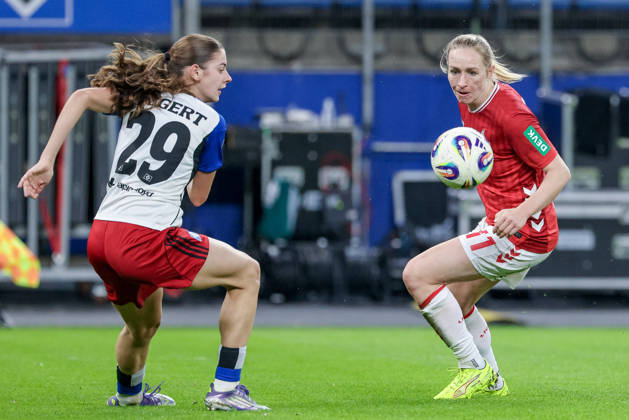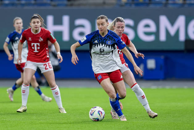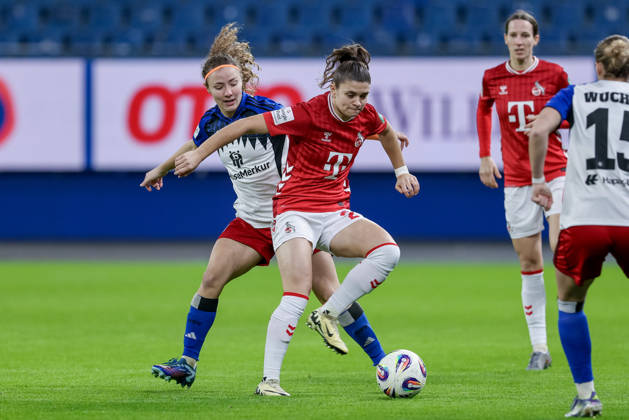 v.li.: Sophie Hillebrand (Hamburger SV, 22) und Sandra Maria Jessen (1. FC Köln, 6) im Zweikampf, Duell, Dynamik, Aktion, Action, Spielszene, DIE DFB-RICHTLINIEN UNTERSAGEN JEGLICHE NUTZUNG VON FOTOS ALS SEQUENZBILDER UND ODER VIDEOÄHNLICHE FOTOSTRECKEN. DFB REGULATIONS PROHIBIT ANY USE OF PHOTOGRAPHS AS IMAGE SEQUENCES AND OR QUASI-VIDEO., 08.12.2025, Hamburg (Deutschland), Fussball, Google Pixel Frauen-Bundesliga, Hamburger SV - 1. FC Köln *** from left Sophie Hillebrand Hamburger SV, 22 and Sandra Maria Jessen 1 FC Köln, 6 in duel, duel, dynamics, action, action scene, THE DFB REGULATIONS PROHIBIT ANY USE OF PHOTOGRAPHS AS IMAGE SEQUENCES AND OR QUASI VIDEO , 08 12 2025, Hamburg Germany , Football, Google Pixel Womens Bundesliga, Hamburger SV 1 FC Köln xobx