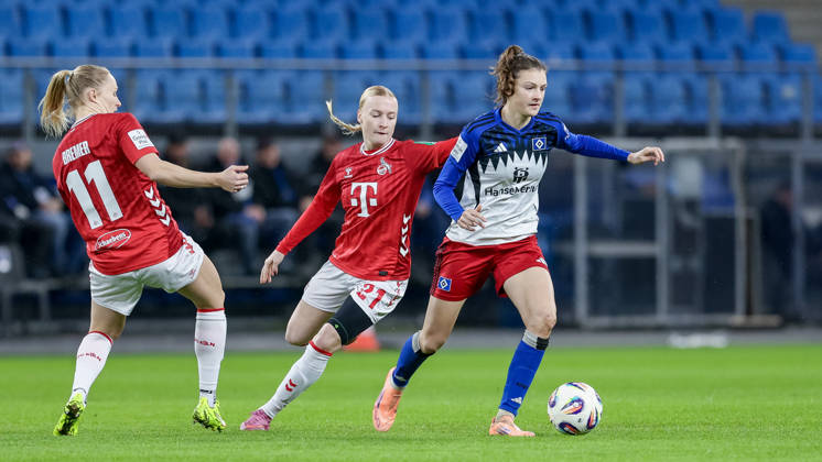 v.li.: Pauline Bremer (1. FC Köln, 11), Lotta Wrede (Hamburger SV, 32) und Anna Gerhardt (1. FC Köln, 21) im Zweikampf, Duell, Dynamik, Aktion, Action, Spielszene, DIE DFB-RICHTLINIEN UNTERSAGEN JEGLICHE NUTZUNG VON FOTOS ALS SEQUENZBILDER UND ODER VIDEOÄHNLICHE FOTOSTRECKEN. DFB REGULATIONS PROHIBIT ANY USE OF PHOTOGRAPHS AS IMAGE SEQUENCES AND OR QUASI-VIDEO., 08.12.2025, Hamburg (Deutschland), Fussball, Google Pixel Frauen-Bundesliga, Hamburger SV - 1. FC Köln *** from left Pauline Bremer 1 FC Köln, 11 , Lotta Wrede Hamburger SV, 32 and Anna Gerhardt 1 FC Köln, 21 in duel, duel, dynamics, action, action, game scene, THE DFB REGULATIONS PROHIBIT ANY USE OF PHOTOGRAPHS AS IMAGE SEQUENCES AND OR QUASI VIDEO , 08 12 2025, Hamburg Germany , Football, Google Pixel Womens Bundesliga, Hamburger SV 1 FC Köln xobx