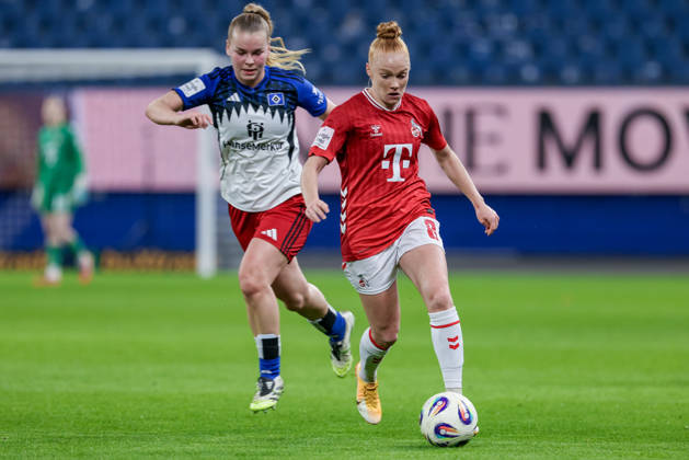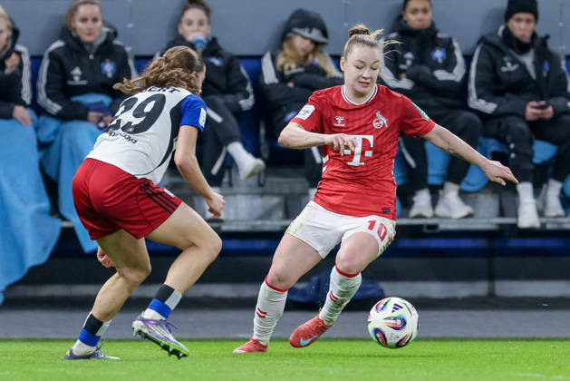 v.li.: Pauline Bremer (1. FC Köln, 11) und Pauline Machtens (Hamburger SV, 28) im Zweikampf, Duell, Dynamik, Aktion, Action, Spielszene, DIE DFB-RICHTLINIEN UNTERSAGEN JEGLICHE NUTZUNG VON FOTOS ALS SEQUENZBILDER UND ODER VIDEOÄHNLICHE FOTOSTRECKEN. DFB REGULATIONS PROHIBIT ANY USE OF PHOTOGRAPHS AS IMAGE SEQUENCES AND OR QUASI-VIDEO., 08.12.2025, Hamburg (Deutschland), Fussball, Google Pixel Frauen-Bundesliga, Hamburger SV - 1. FC Köln *** from left Pauline Bremer 1 FC Köln, 11 and Pauline Machtens Hamburger SV, 28 in a duel, dynamic, action, action, game scene, THE DFB REGULATIONS PROHIBIT ANY USE OF PHOTOGRAPHS AS IMAGE SEQUENCES AND OR QUASI VIDEO , 08 12 2025, Hamburg Germany , Football, Google Pixel Womens Bundesliga, Hamburger SV 1 FC Köln xobx