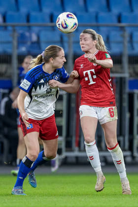 v.li.: Nina Räcke (Hamburger SV, 39) und Sandra Maria Jessen (1. FC Köln, 6) im Kopfballduell, Kopfball, Zweikampf, Action, Aktion, Spielszene, DIE DFB-RICHTLINIEN UNTERSAGEN JEGLICHE NUTZUNG VON FOTOS ALS SEQUENZBILDER UND ODER VIDEOÄHNLICHE FOTOSTRECKEN. DFB REGULATIONS PROHIBIT ANY USE OF PHOTOGRAPHS AS IMAGE SEQUENCES AND OR QUASI-VIDEO., 08.12.2025, Hamburg (Deutschland), Fussball, Google Pixel Frauen-Bundesliga, Hamburger SV - 1. FC Köln *** from left Nina Räcke Hamburger SV, 39 and Sandra Maria Jessen 1 FC Köln, 6 in header duel, header, duel, action, action, game scene, THE DFB REGULATIONS PROHIBIT ANY USE OF PHOTOGRAPHS AS IMAGE SEQUENCES AND OR QUASI VIDEO , 08 12 2025, Hamburg Germany , Football, Google Pixel Womens Bundesliga, Hamburger SV 1 FC Köln xobx