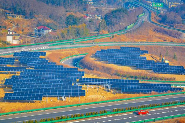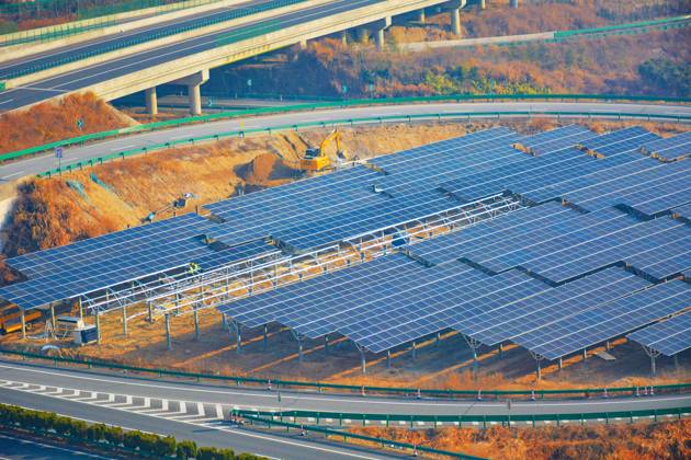 PV ANQING, CHINA - JANUARY 16, 2026 - Workers are installing photovoltaic power generation equipment next to a highway in Yuexi County, Anqing City, Anhui Province, China on January 16, 2026. Anqing Anhui China PUBLICATIONxNOTxINxCHN Copyright: xCFOTOx i1768569291596