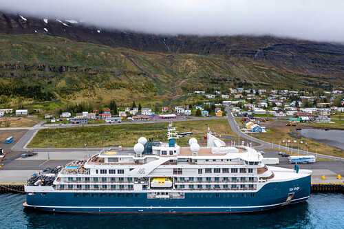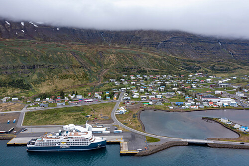 Aerial view of SH Vega cruise is an expedition cruise ship operated by Swan Hellenic, docked in Seyðisfjörður harbour Seydisfjordur, Iceland.