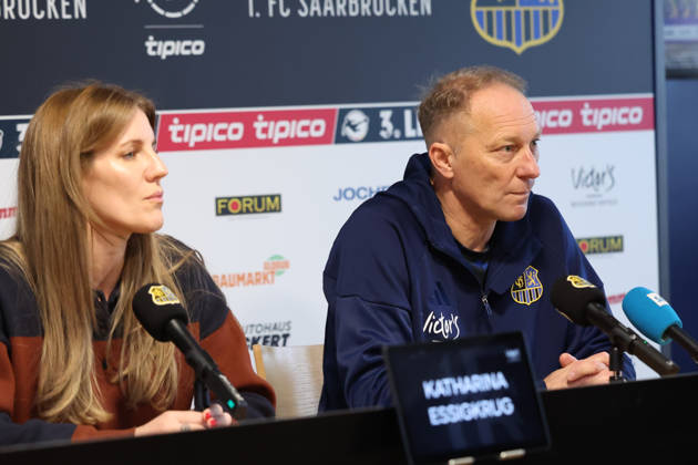 28.11.2025, xrekx, Fussball 3.Liga, 1.FC Saarbruecken - Pressekonferenz v.l. Katharina Essigkrug Pressesprecherin (1.FC Saarbruecken) Jürgen Juergen Luginger Sportdirektor (1.FC Saarbruecken) (DFL DFB REGULATIONS PROHIBIT ANY USE OF PHOTOGRAPHS as IMAGE SEQUENCES and or QUASI-VIDEO) Saarbruecken *** 28 11 2025, xrekx, Fussball 3 Liga, 1 FC Saarbruecken Press Conference v l Katharina Essigkrug Press Spokeswoman 1 FC Saarbruecken Jürgen Juergen Luginger Sports Director 1 FC Saarbruecken DFL DFB REGULATIONS PROHIBIT ANY USE OF PHOTOGRAPHS as IMAGE SEQUENCES and or QUASI VIDEO Saarbruecken